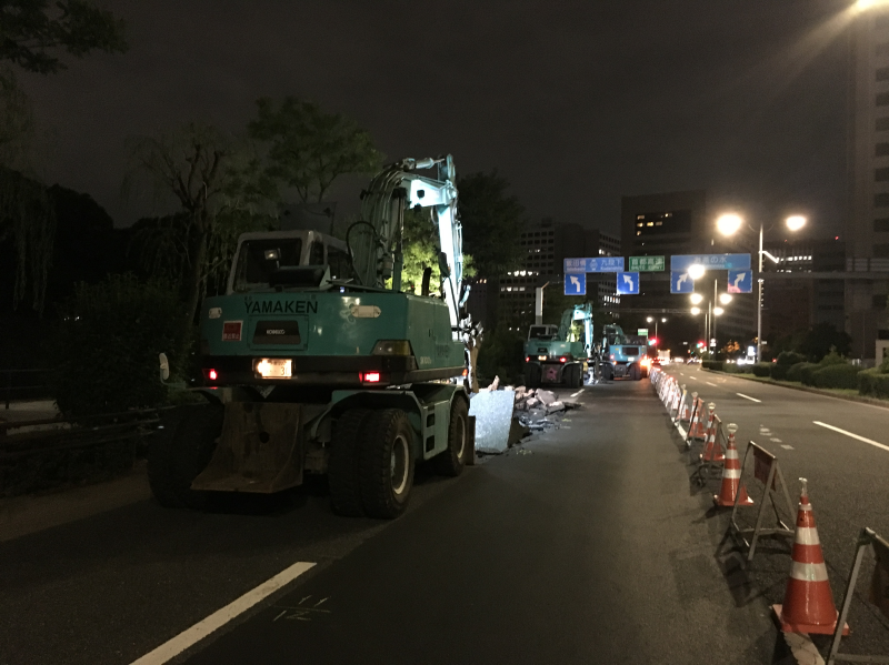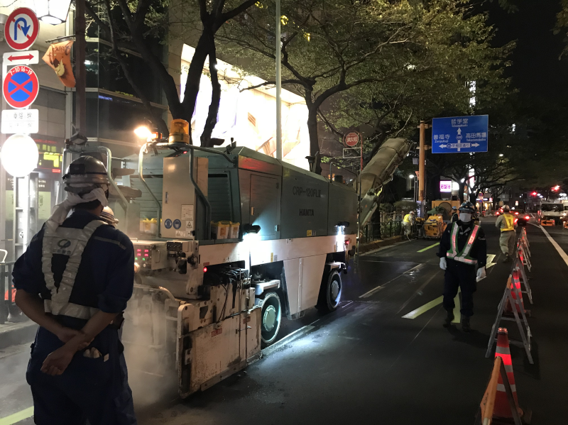 また、昼夜問わず幹線道路は交通量に応じて通行止めできる時間が限られるので夜間の工事になる事もあります。